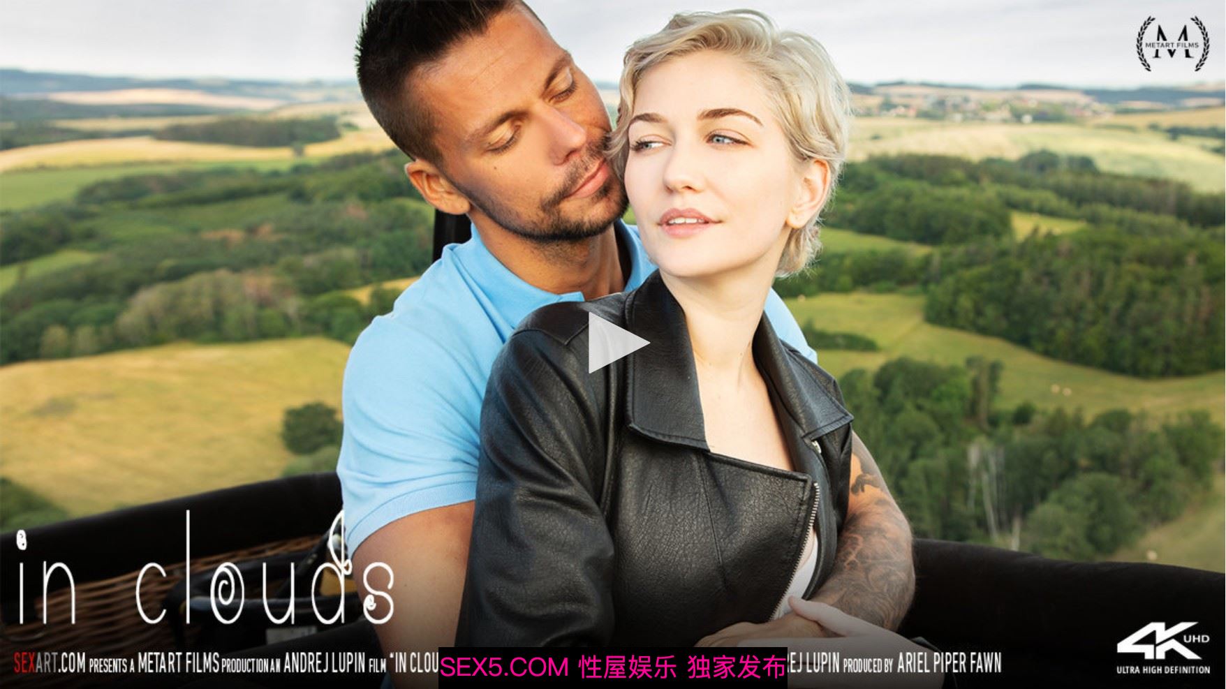 Gorgeous blonde Skye Blue takes a ride in a hot air balloon with Angelo Godshack. As Andrej Lupin’s erotic movie "In Clouds" begins, the romantic pair soar above the landscape; and when they return to earth, their lovemaking reaches new heights of pleasure. They kiss passionately in the shelter of the balloon, hands roaming over each other’s body. In the bedroom, stripped down to her sexy lingerie, Skye straddles Angelo, letting him squeeze and fondle her beautiful breasts. She takes off her bra so her big boobs jiggle in his face as she strokes his stiff cock, then guides it into her tight pussy. Gasping with pleasure, Skye rocks her hips to slide up and down on Angelo’s rigid dick, riding vigorously. He flips her onto her back, thrusting into her with slow intensity, then going down to finger and eat her shaved pussy until she’s at boiling point before penetrating her again. He fucks her to a powerful orgasm - her boobs wobbling hypnotically - and fills her with his hot load, the perfect climax to their wonderful day.