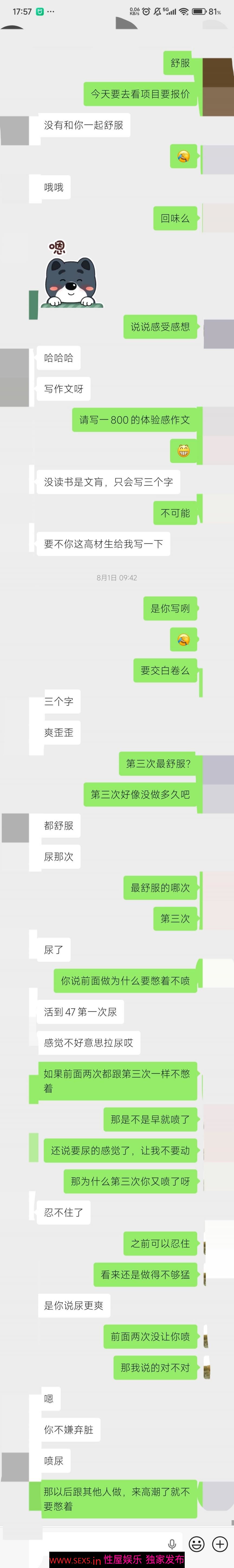 她是那种敏感体质,鸡巴插进去没搞几分钟就来高潮了,她来高潮的时候是全身挺直,一抖一抖的,全身变得很僵硬,嘴里说要我不要动,不要动。鸡巴都容易被她不自主得抽出来,她一来高潮就我就不太好继续抽插了。我拜读学习了有些大佬的分享经验说女人喷水的经历,感觉这样的敏感体质只要在来高潮后继续给持续强烈的刺激是容易喷水的,后面跟她聊感受证实确实真是这样的。我学以致用,她来高潮的时候我尽量控制住她的下半身,用力顶住她的身体抽插。经历不知多少轮的高潮后强制再高潮,最后在女上位的时候她终于喷了。喷的时候很感觉到一股热流包裹着我的鸡巴,从阴道深处往外流出来,还流到了我会阴部,这感觉真的太妙了。后来她说每次来高潮的时候就会有拉尿的感觉才叫我不要动,她自己怕尿出来尴尬我笑话她才尽量控制不拉。我持续在她来高潮时给她刺激很多次后,最后因为自己没法控制住了就喷了出来,她说活这么多年第一次被草喷,原来来高潮后继续草是这么爽。起身拔屌一看,真喷了,只是喷的不是很多,床单都湿了,但是照片里拍的那一块是湿透的,没有干的地方对比看得不明显(后面忘记拍了床单的整体照,因为她不太愿意拍照录视频,我只能跟她说只是我们两个欣赏看,而且不露脸,也为了保护各自的隐私确实没有拍脸,看完就当面删掉了,后面我是从手机回收站里找回来的),但是可以看到她大腿根那里都还有点水渍在。